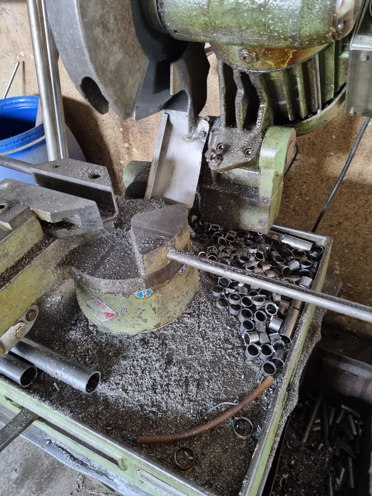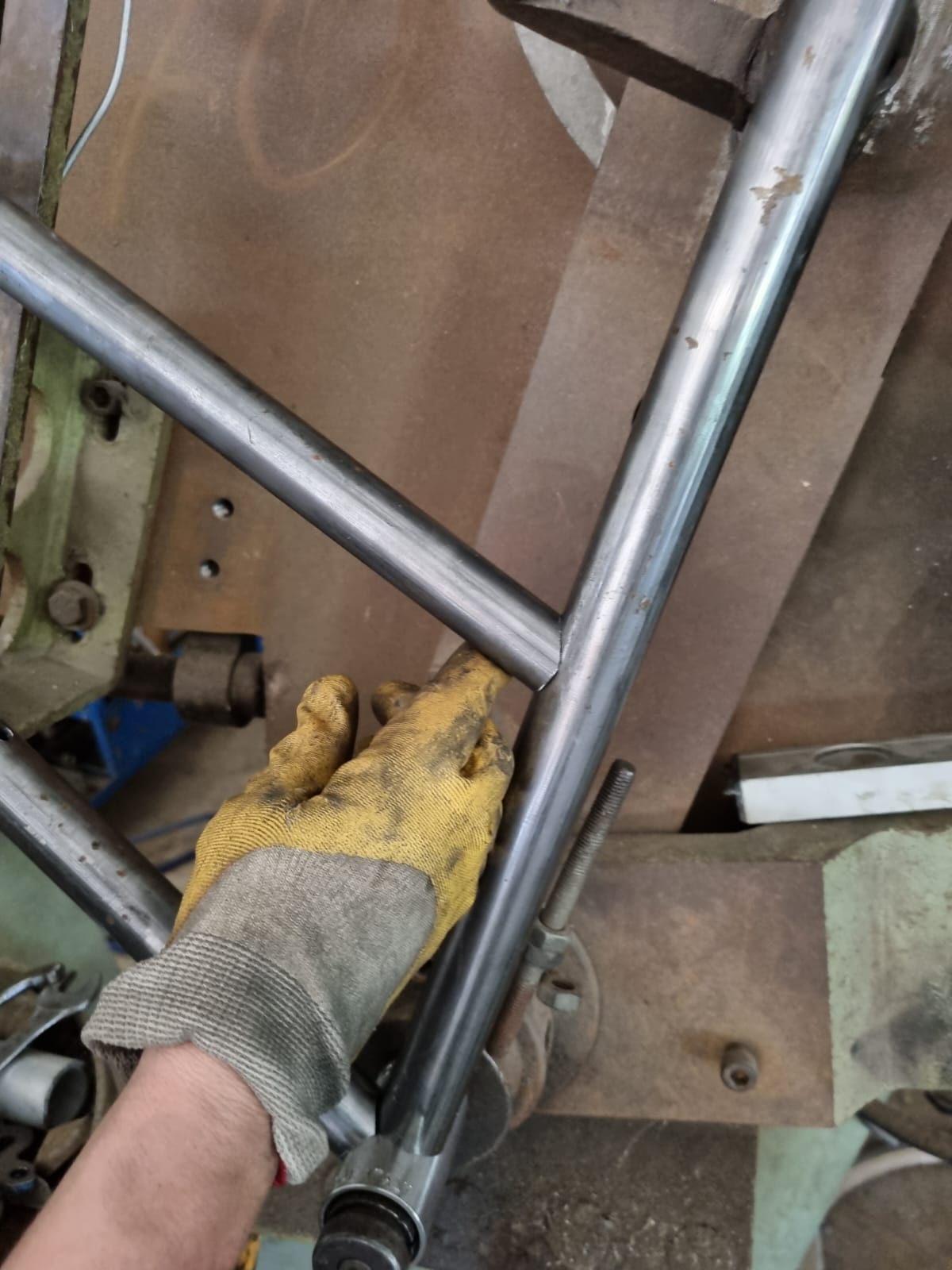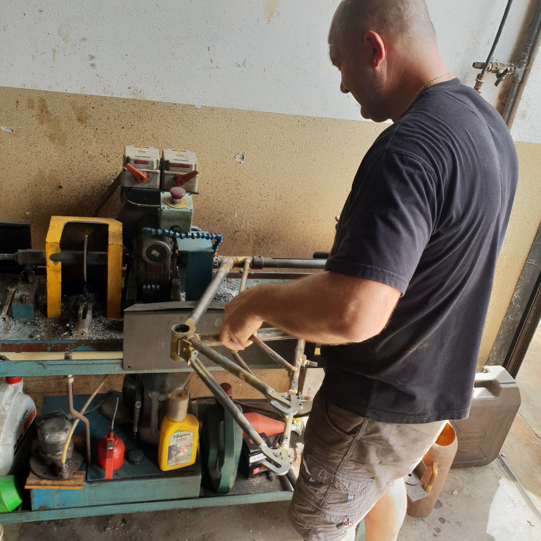Rahmenbau händisch in Italien von Patrizia. Die Rohre für den gemufften Stahlrahmen werden auch in Italien gefertigt.